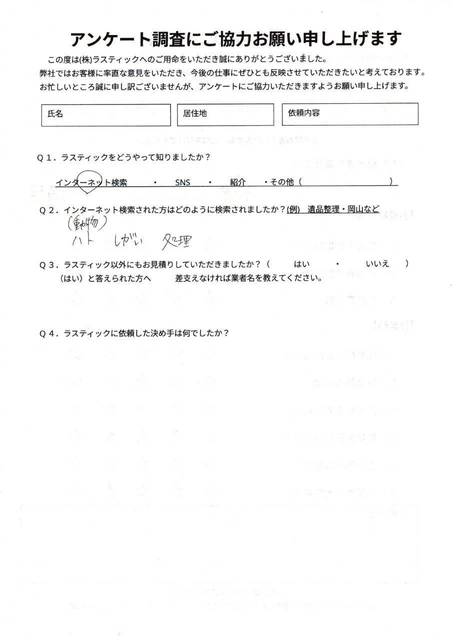 庭に鳩の死骸がいる為、回収してほしい。人工芝の除菌も・・